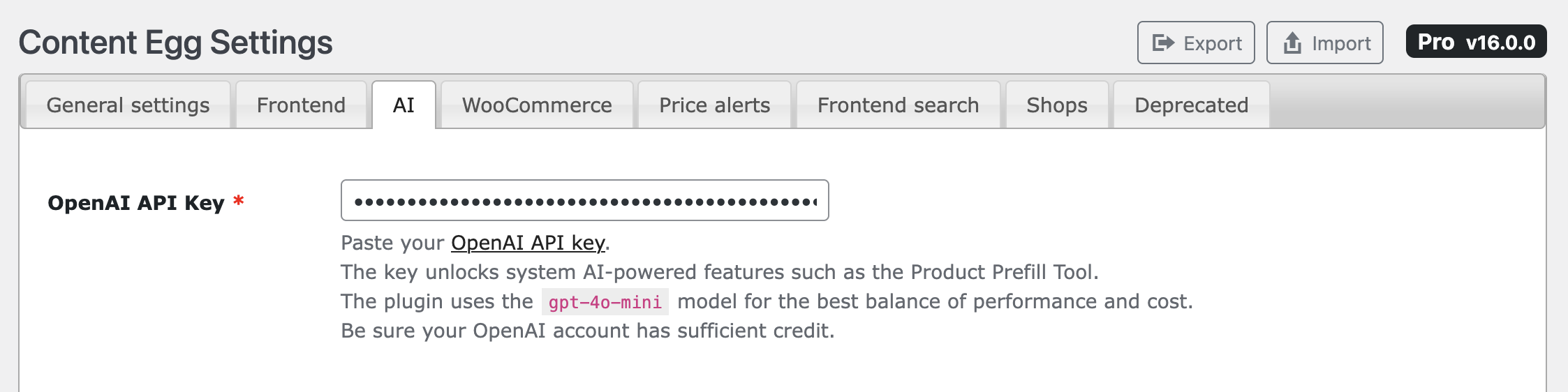 **Content Egg > Settings > AI > OpenAI API Key**\
