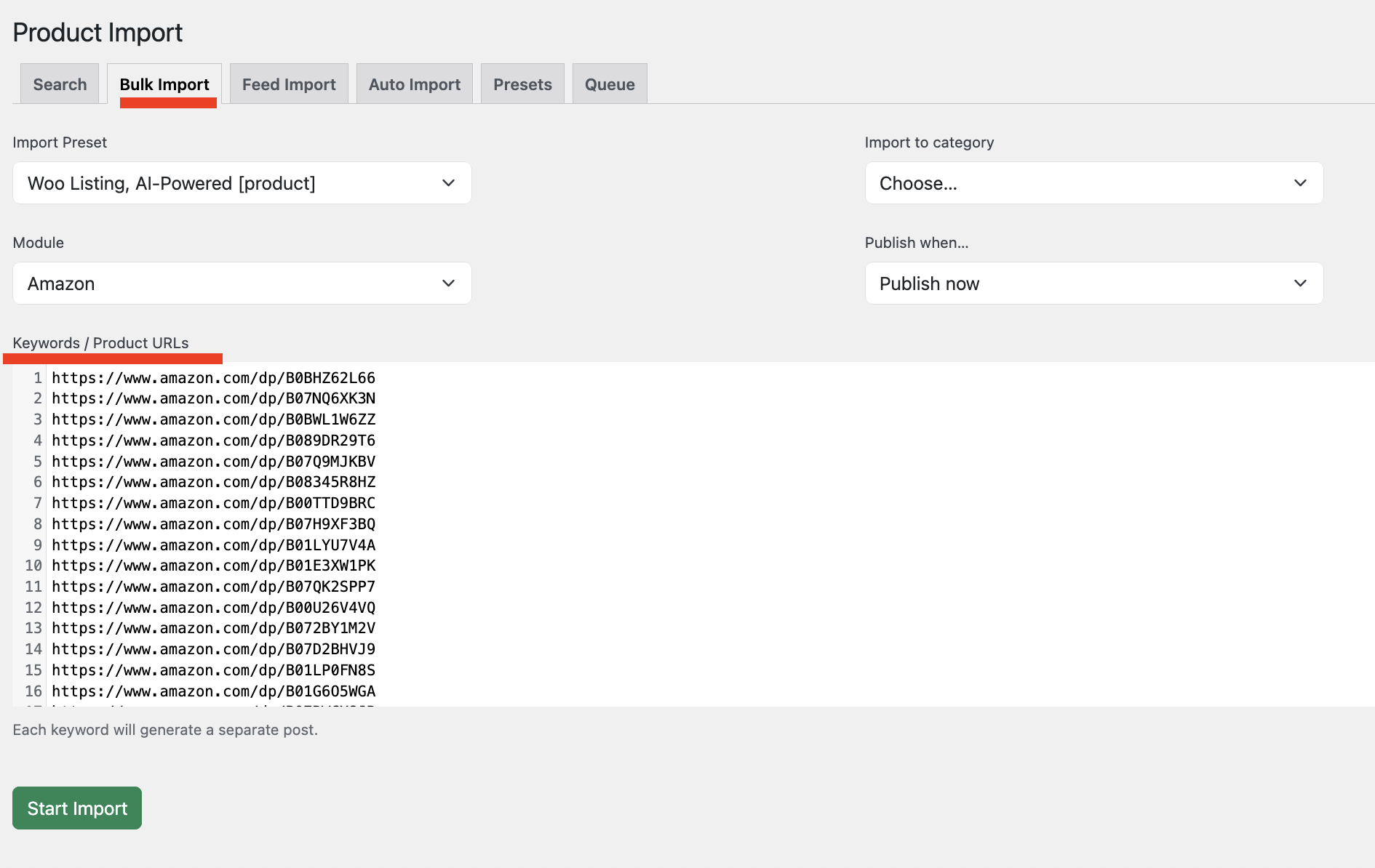 Each keyword in the list will generate a separate post or product.