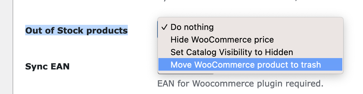 If you are utilizing WooCommerce sync, you can manage this through a separate setting. In Content Egg, go to Settings > WooCommerce > Out of Stock Products. From there, you can choose to handle out-of-stock WooCommerce products, including the option to delete them.
